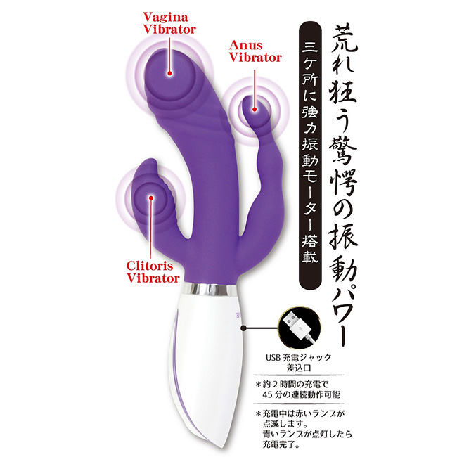 本体サイズ:全長23.0cm、クリバイブ2.4cm、ヴァギナバイブ12.0×Φ3.6cm、アナルバイブ10.0×Φ2.1cm パッケージサイズ:24.0×10.0×5.0cm 重量:220g 電池:USB充電式(コード付属)