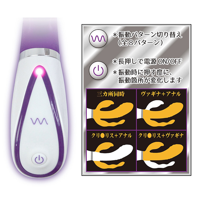 トライデントが3点快感スポットを貫く! ポセイドンの槍のような形をした3点責めバイブレーター!Gスポット・Cスポット・アナルの3点にアプローチする形状でそれぞれの先端に強力なモーターを搭載しており、快感スポットへ同時にダイレクトに振動刺激を与えます。振動パターンには8種類あり、身体の芯まで届く振動をリズミカルに伝えます。弾力があり肌触りの良いメディカルグレードシリコン素材を使っているので、安心安全にお使い頂け、完全防水仕様で水洗いもできお手入れも楽チンです。快感スポット3カ所からビリビリと身体の奥底まで響く振動刺激で、絶頂に達すること間違いなしとなっています!
